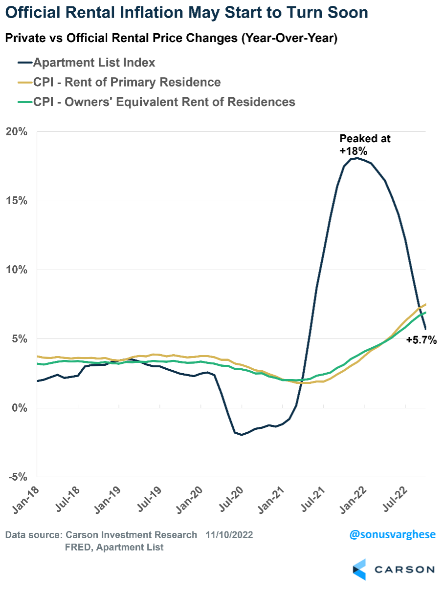 Firstly, the goods deflation in October offset the upward pressure from strong price increases in services, which is primarily rents. It effectively buys time for official rental data to catch up to the private data, which are showing a rapid decline in rents.