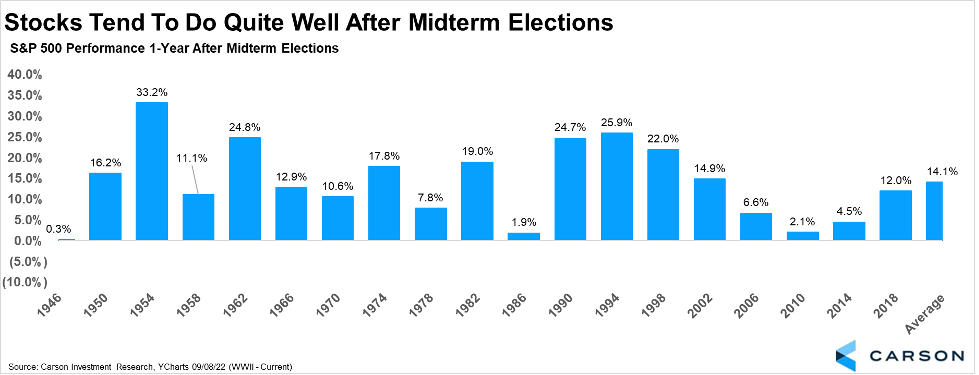 - Stocks have been higher a year after midterm elections ever since World War II.