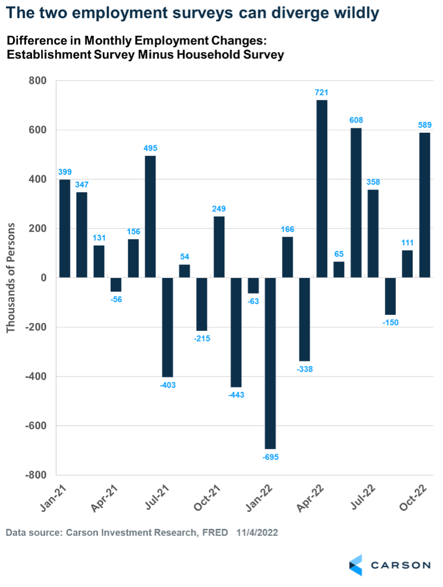 In the October report, the unemployment rate rose because the household survey showed the number of unemployed persons rose. The survey also showed the number of employed workers fell by 328,000, which is completely opposite of what the establishment report showed (+261,000). That’s a massive difference of almost 600,000. But this is not unusual, as the chart below illustrates.
