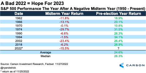 • When the S&P 500 has closed lower during a midterm year (such as will likely happen this year), it was higher the following year every time (8 for 8) and up a very impressive 24.6% on average since 1950.