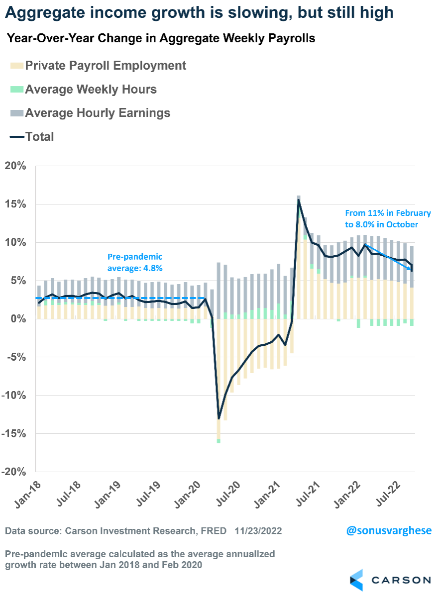 Most consumers spend out of their wages, so it helps to look at overall income in the economy. The chart below shows the year-over-year growth in aggregate weekly earnings, i.e., weekly earnings across all workers, which can be attributed to three sources:
