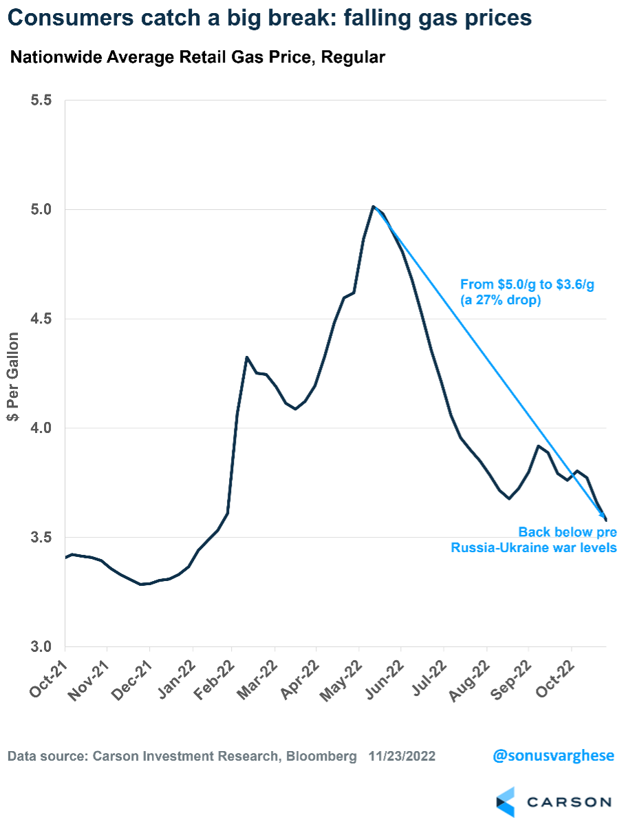 But the consumer got a big break recently in the form of retreating gas prices. Gas prices are now almost back to where they were on the eve of Russia’s invasion of Ukraine. In a sense, just like higher gas prices were effectively a tax on incomes, falling gas prices are akin to a tax cut.