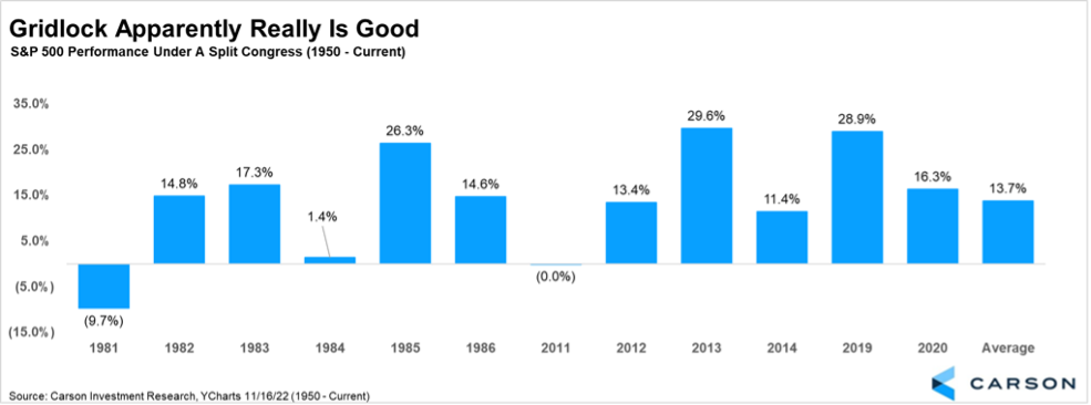 There’s an old saying that ‘gridlock is good’ for the markets, as Washington can’t do much when no one can agree. The chart below shows the S&P 500’s performance during the years of divided government since 1950. The average return for stocks was a very solid 15.7%, with only 1981 falling significantly and 2011 breaking even. The other years saw solid returns, suggesting gridlock indeed could be positive for the markets.