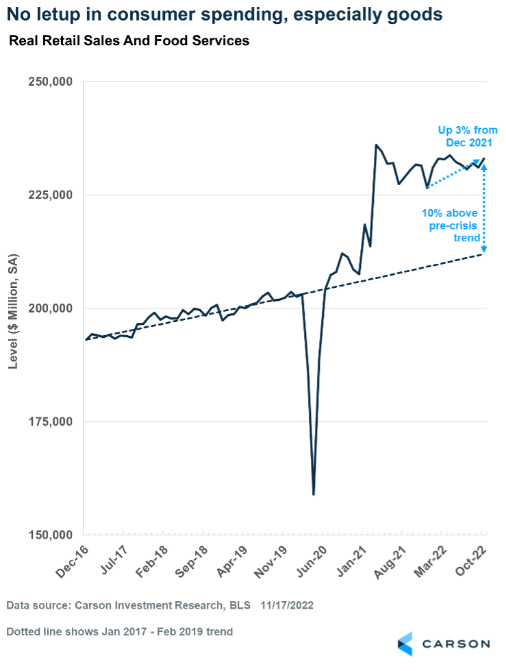 One way to account for higher prices across several of these categories is to look at “real retail sales,” i.e., sales adjusted for prices. Real sales rose 0.8% in October, which is the fastest pace in eight months. Real sales had slowed in the summer (May-August), but they are picking up again — a sign of rising “real” incomes thanks to a pullback in inflation. Real sales are now up 3% from December 2021 through October. And in real terms, consumers are spending 10% more than expected if we just extended the pre-pandemic trendline. That’s massive!
