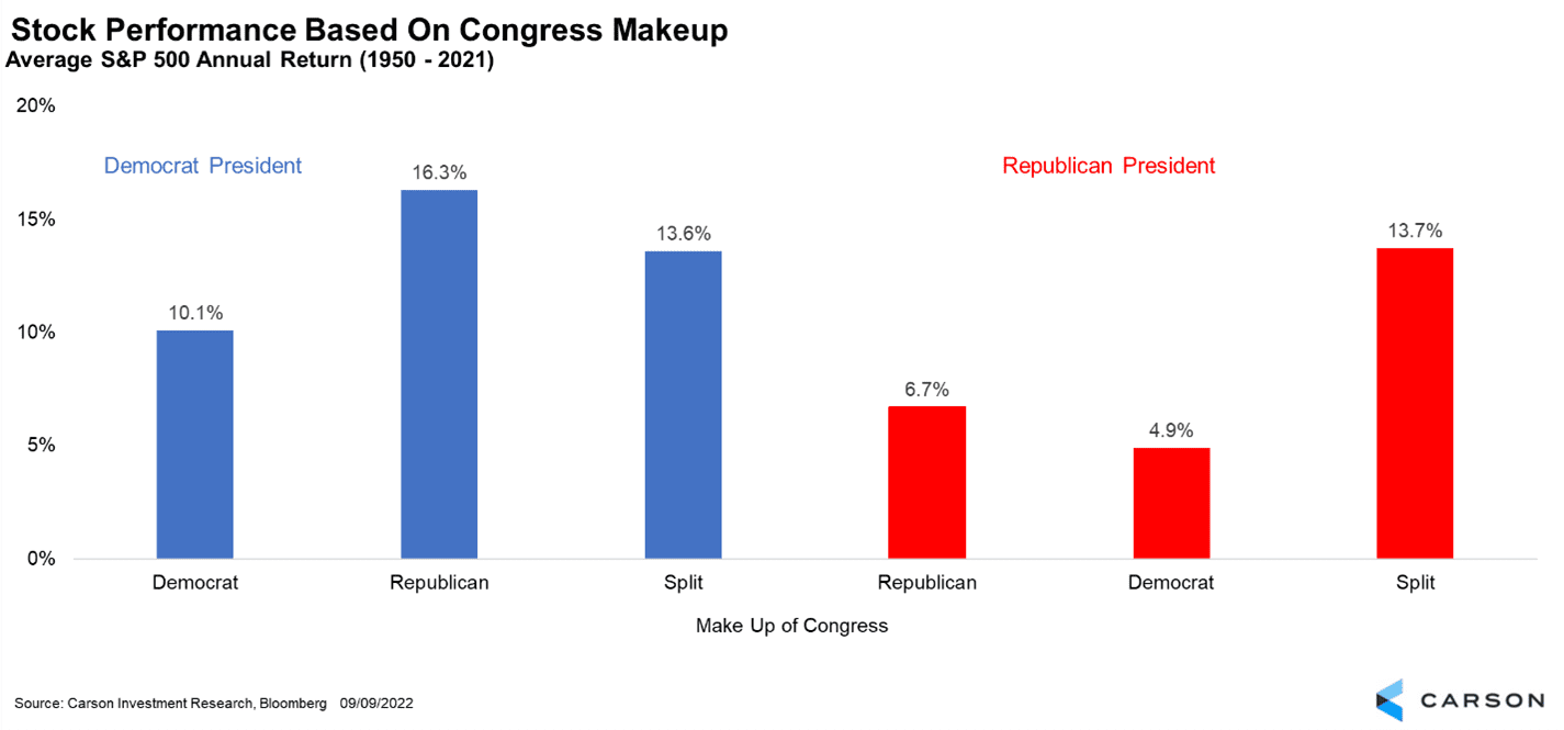 Midterm elections are not typically favorable for the party in power. Since World War II, the controlling party has lost four seats in the Senate and 26 seats in the House on average. This year, Republicans only need five seats to flip the House and most strategists think this is quite possible. The Senate is split 50/50, but the open Senate seats are closely contested and considered a coin flip by many. What does this mean for investors? The best scenario for stocks is a Democratic president and Republican-controlled Congress (this was the case in the late 1990s under President Bill Clinton). A Democratic president with a split Congress has also generated solid returns in the past. Both scenarios suggest post-November, history will be with the bulls.