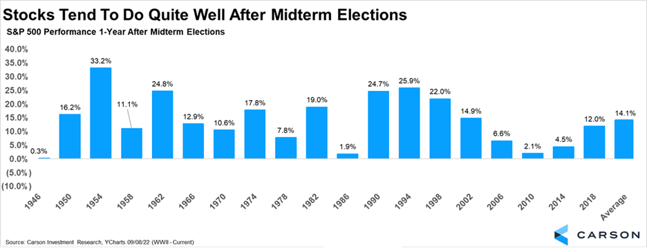 On this subject, we prefer to take a broader view and share another important takeaway for investors. From the date of the midterm election going out one-year, the S&P 500 has been higher every single time since World War II. Not all years were up significantly, but a consistent gain and an average of 14.1% is worth noting.