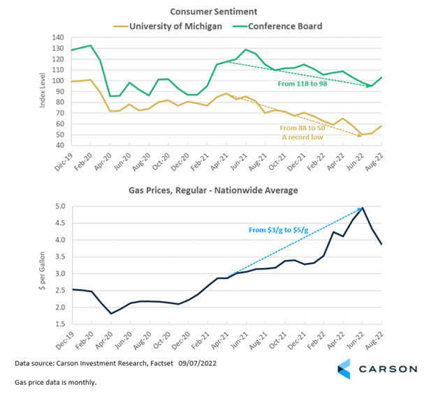 But over the last four to eight weeks, sentiment indicators have picked up again just as gas prices have seen a steep fall, from $5/gallon to about $3.75.