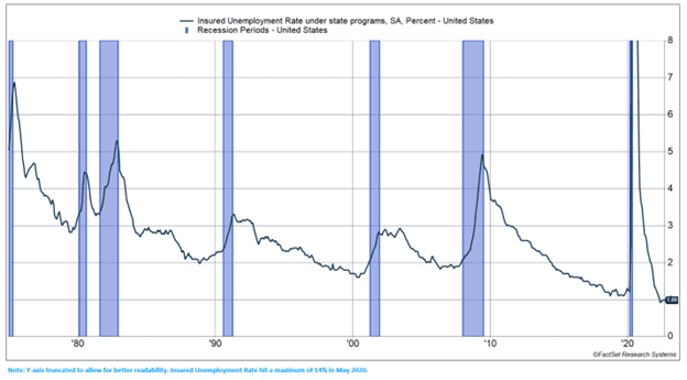 Moreover, recent unemployment claims data suggest the labor market remains strong. Unemployed workers who are continuing to collect unemployment benefits now make up 1% of the labor force, which is a record low. This is not something we would expect if the economy were in a recession.