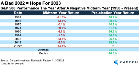 Historically, midterm election years are the worst for stocks out of the four-year presidential cycle, but the good news is the best year is the following one, the pre-election year. Looking at the past eight times a midterm year was lower, the following year was higher every single time, up 24.6% on average. This could have bulls smiling in 2023 should history repeat.