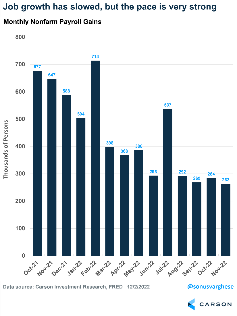 The big headline for the November payroll report was that 263,000 jobs were created last month, well above expectations of 200,000. Job growth has slowed since the beginning of the year, but make no mistake, this is still a very strong pace of job growth. As Fed Chair Jerome Powell noted in his recent comments, Fed members think monthly job gains of 100,000 are required to keep up with population growth. We’ve been well above that recently.