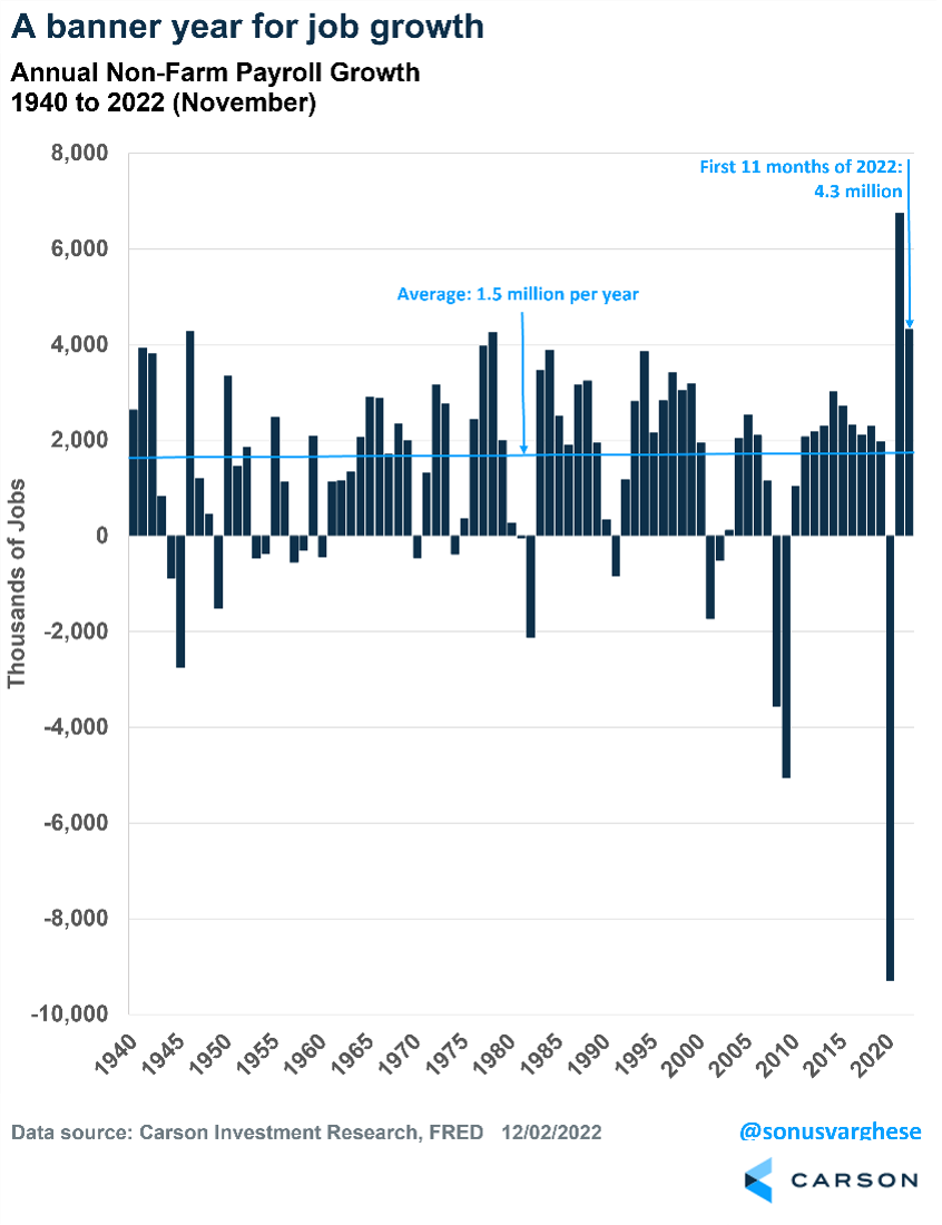Overall job growth in 2022 totaled a whopping 4.3 million, putting it in line for the second-best year for job creation in 83 years (only last year was better). Also, the unemployment rate is currently at 3.7%, which is close to a record low.