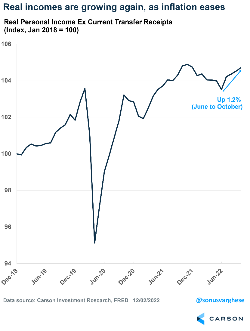 The biggest reason for accelerating consumption is incomes are rising again after adjusting for prices. Real personal incomes have increased by 1.2% over the five months through October.